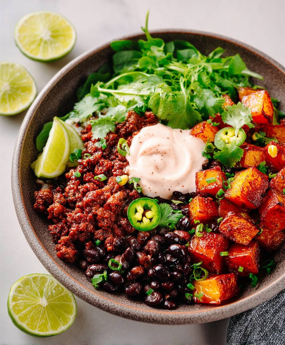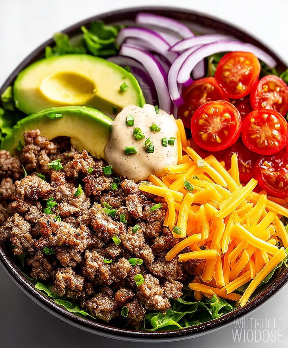 Ein Rezept für proteinreiche Cheeseburger-Gerichte – Zubereitung von kohlenhydratarmen Mahlzeiten mit Rinderhackfleisch und Burgersauce.